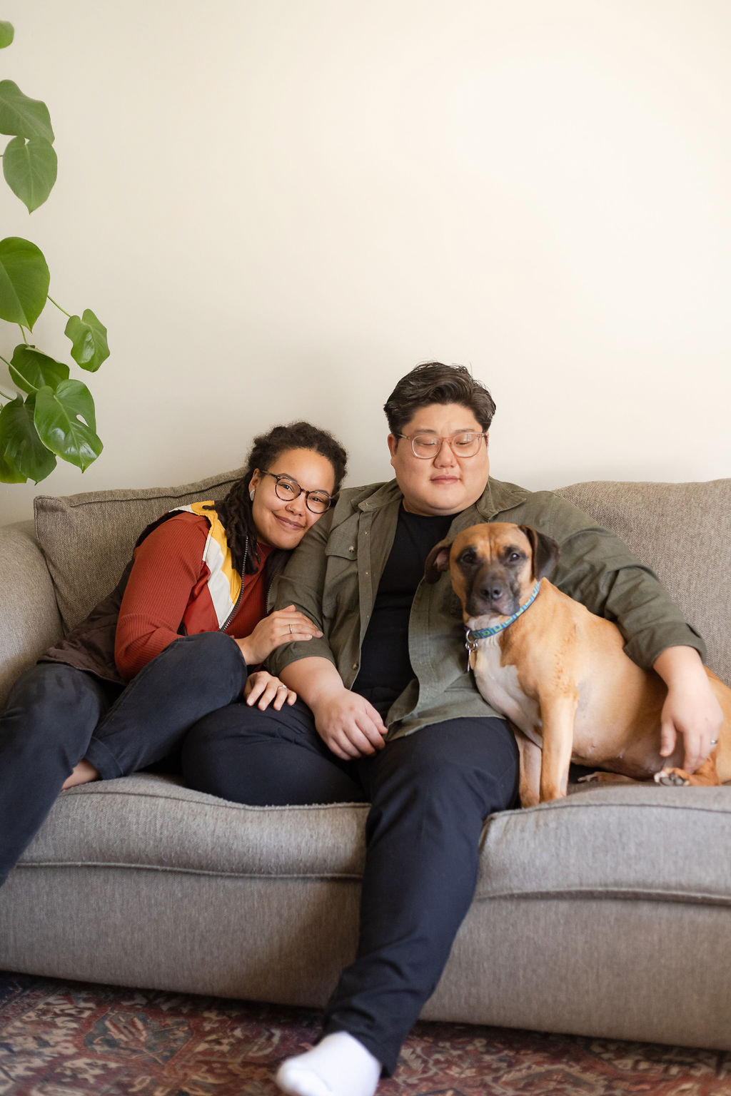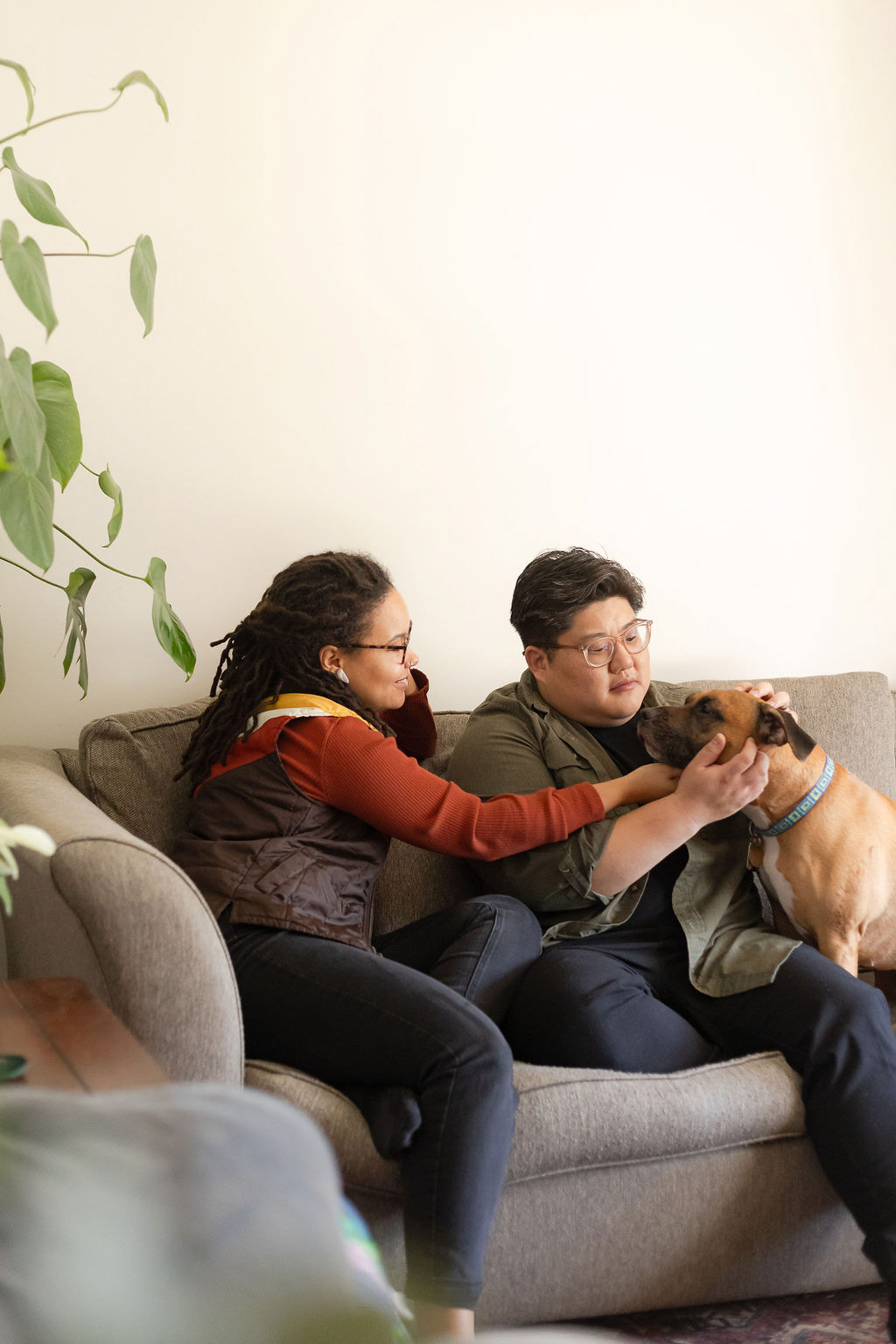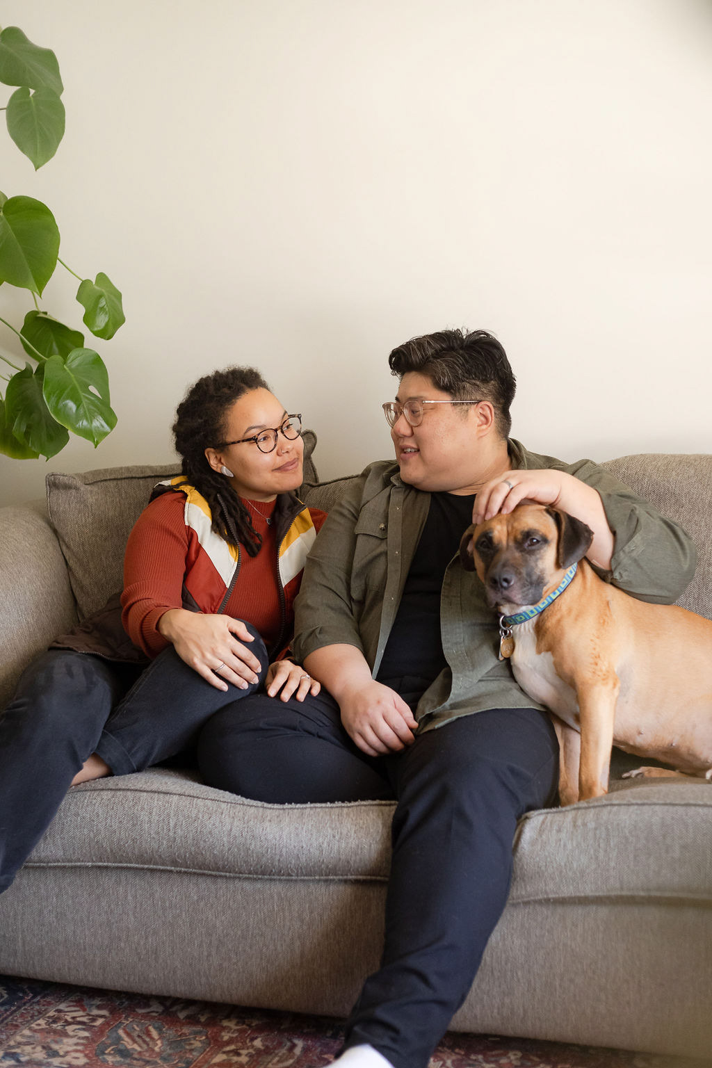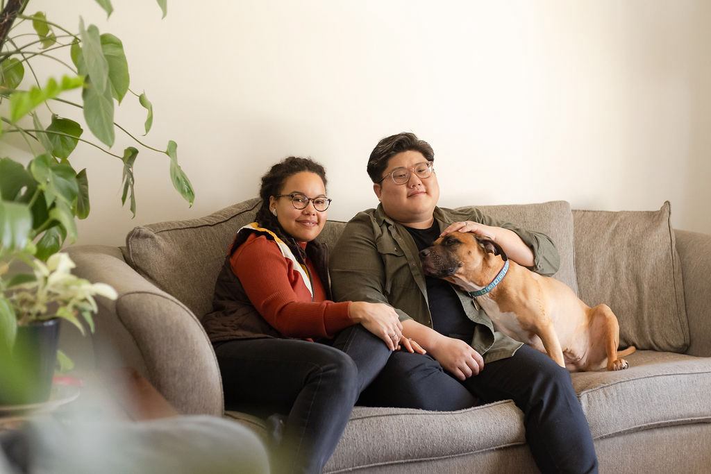 Laid-back, in-home sessions like this are always fun to capture. Even though this couple had never done a photoshoot before and felt a bit camera-shy at first, it wasn't long until we were getting effortless moments that reflected their everyday life together with their pup and chickens.